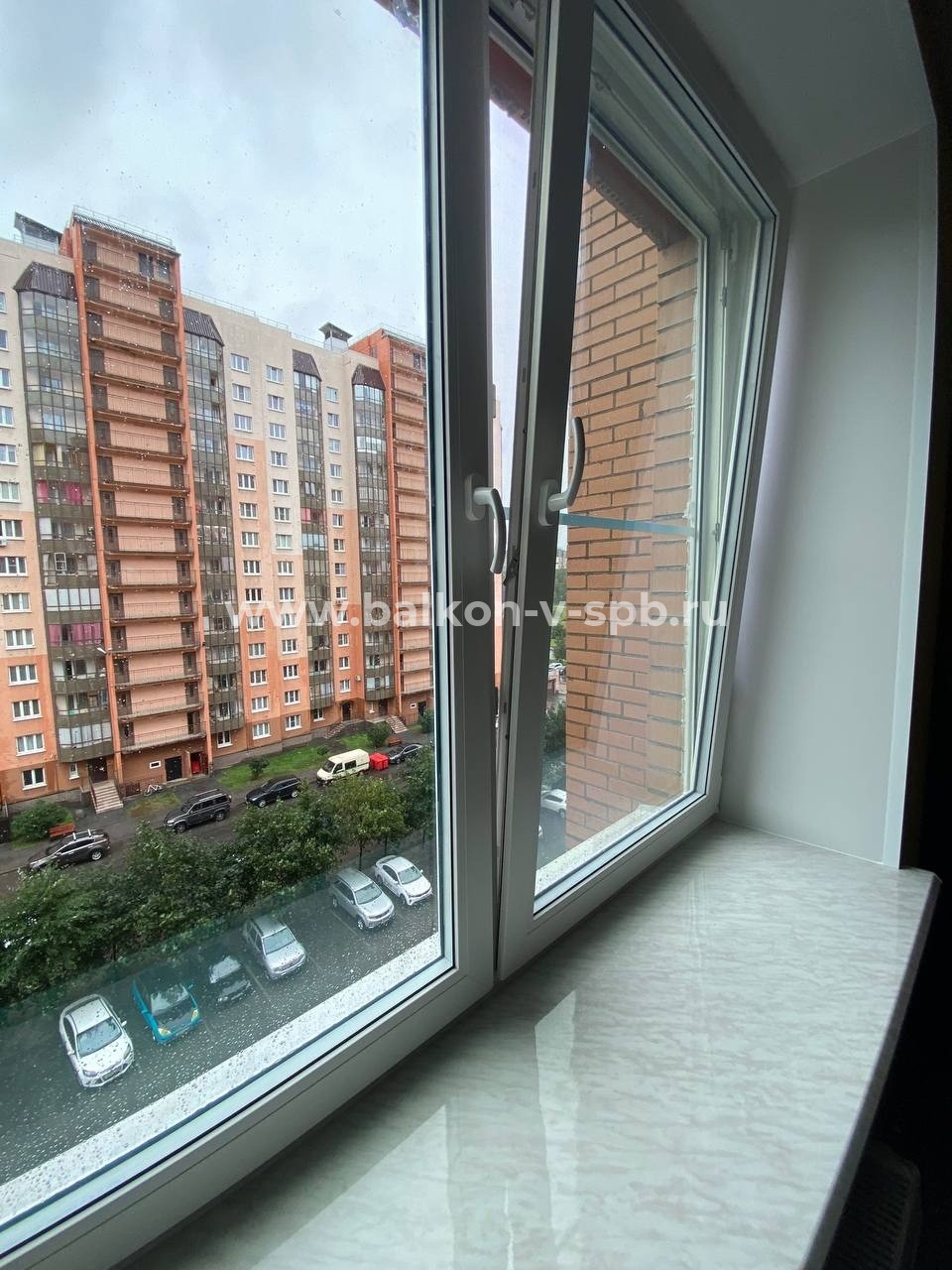- После нахождения правильной позиции подоконника наши мастера переходят к этапу крепления. Оно производится качественной монтажной пеной, которая равномерным слоем заполняет все пространство.